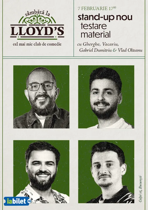 Te așteptăm la Lloyd's Comedy Club să te distrezi alături de noi la un Show de Stand-up Comedy oferit de 4 comedianți talentați, pregătiți să te facă să râzi cu momentele lor pline de umor.