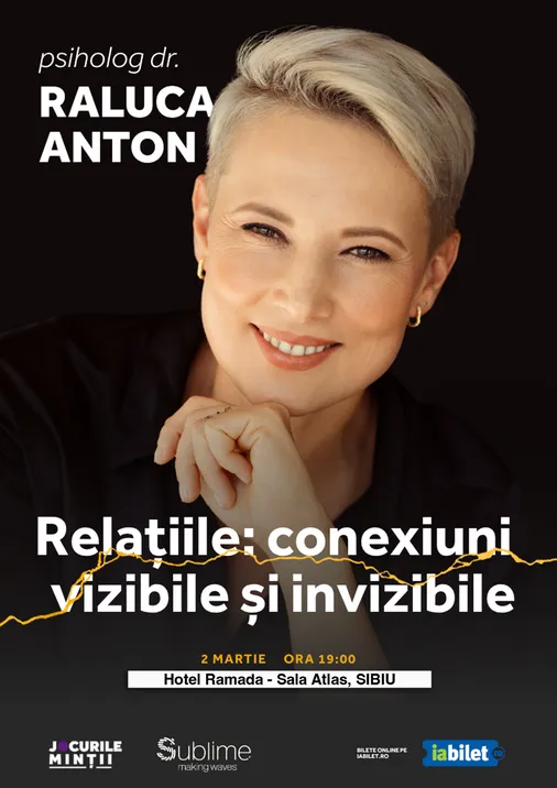 În această seară, Raluca va vorbi despre conceptul de sine relațional și despre felul în care relațiile vizibile și invizibile din viața noastră influențează modul în care gândim, simțim și trăim. Publicul va fi ghidat printr-o perspectivă care aduce claritate asupra tiparelor noastre relaționale și a modului în care putem construi legături mai conștiente, mai vii și mai sănătoase.