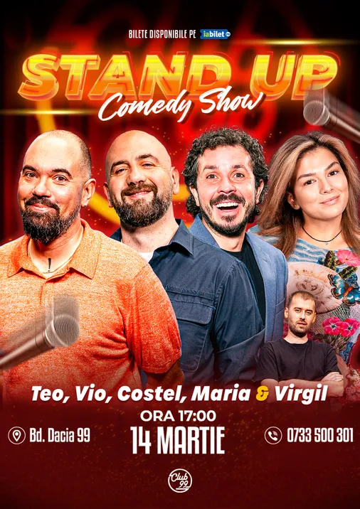 Vă așteptăm la o seară de stand-up comedy alături de Teo, Vio, Costel, Maria Popovici - Virgil Ciulin